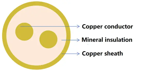 Кабелі з мінеральною ізоляцією складаються з мідного провідника, порошкової мінеральної ізоляції з оксиду магнію та мідної оболонки. Якщо кабелі використовуються на заводах, де мідь викликає корозію, можна додати зовнішній шар полівінілхлориду (ПВХ). У будівлях або підземних приміщеннях, де для кабелю важлива естетика або легкий доступ, можна додати зовнішню оболонку з низьким рівнем диму, яка не містить галогенів.