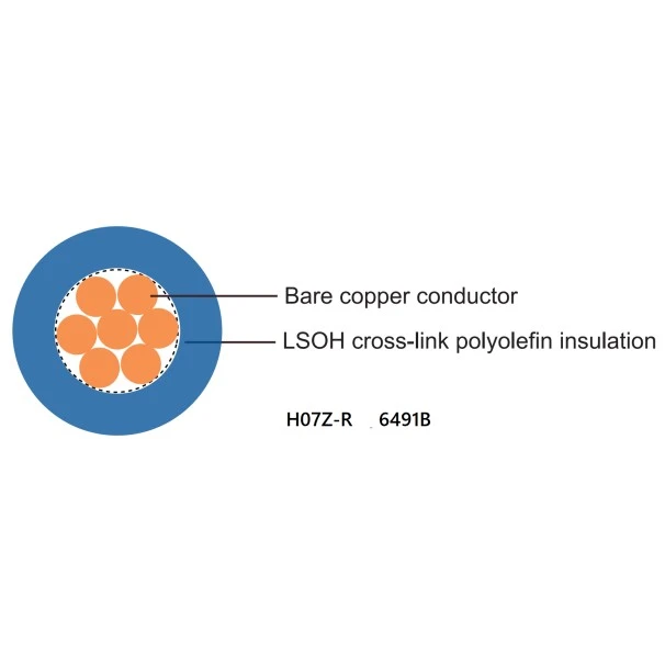 Ізольований одножильний кабель LSZH, який складається з мідного провідника T1R та поліолефінової ізоляції з перехресними зв’язками LSOH (також називається LSOH термореактивної).